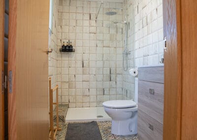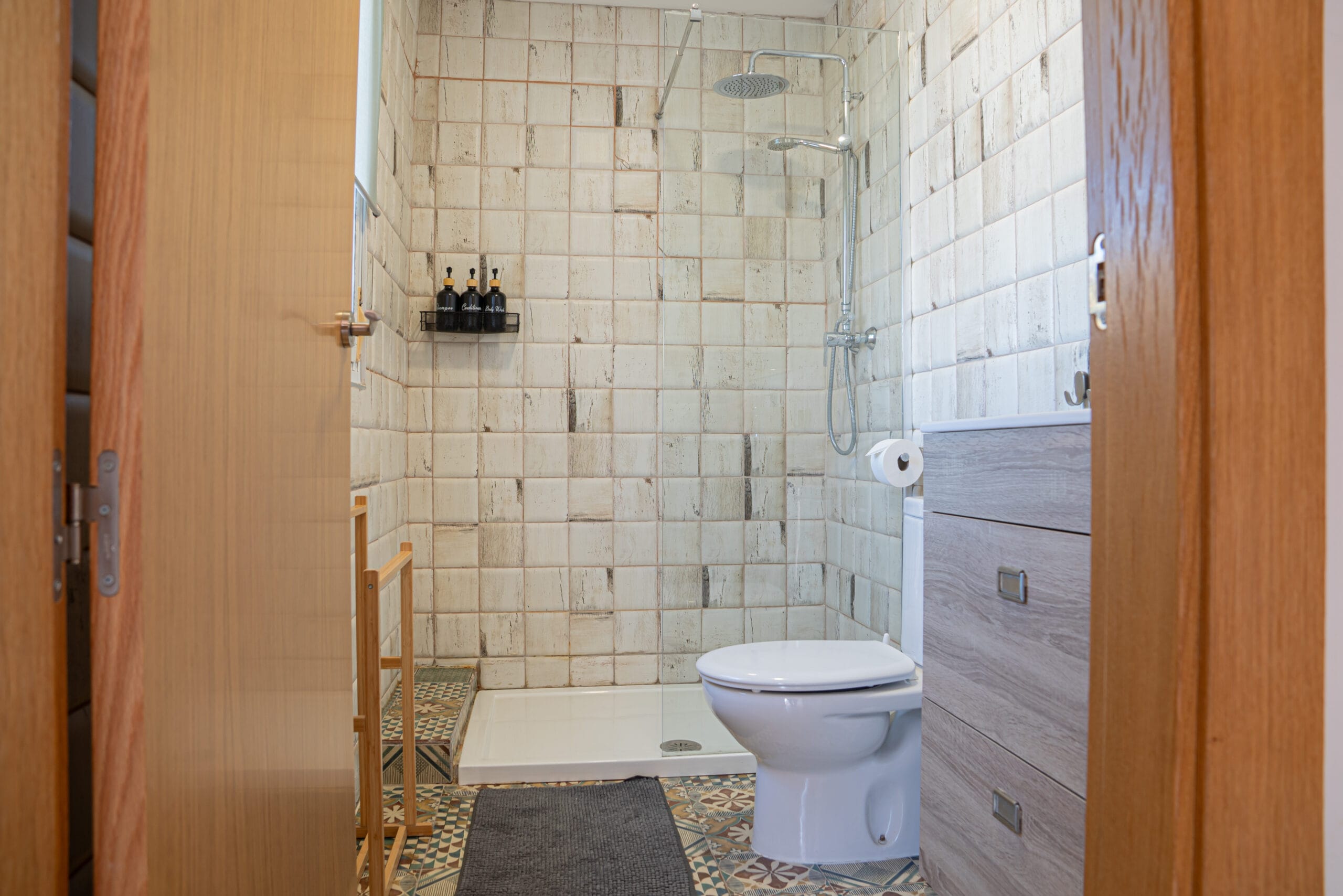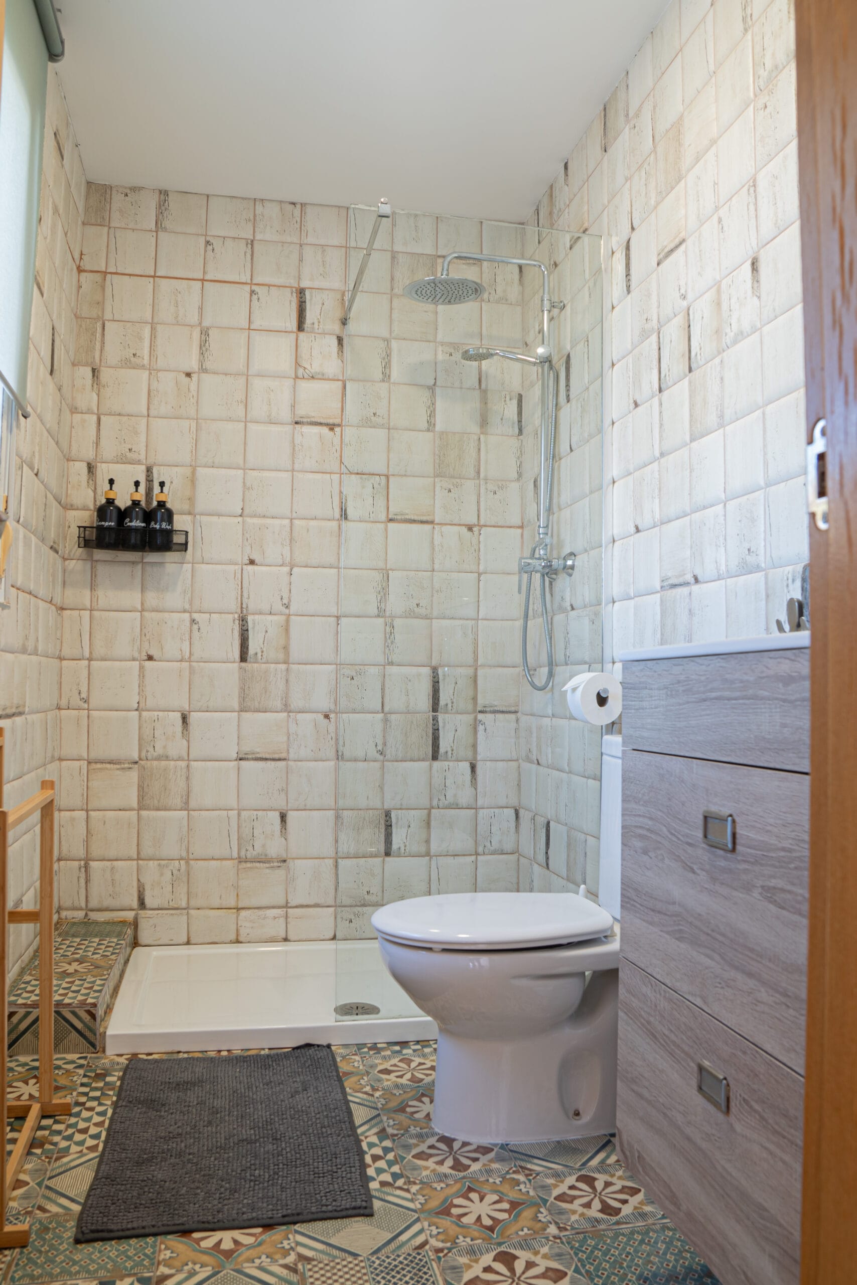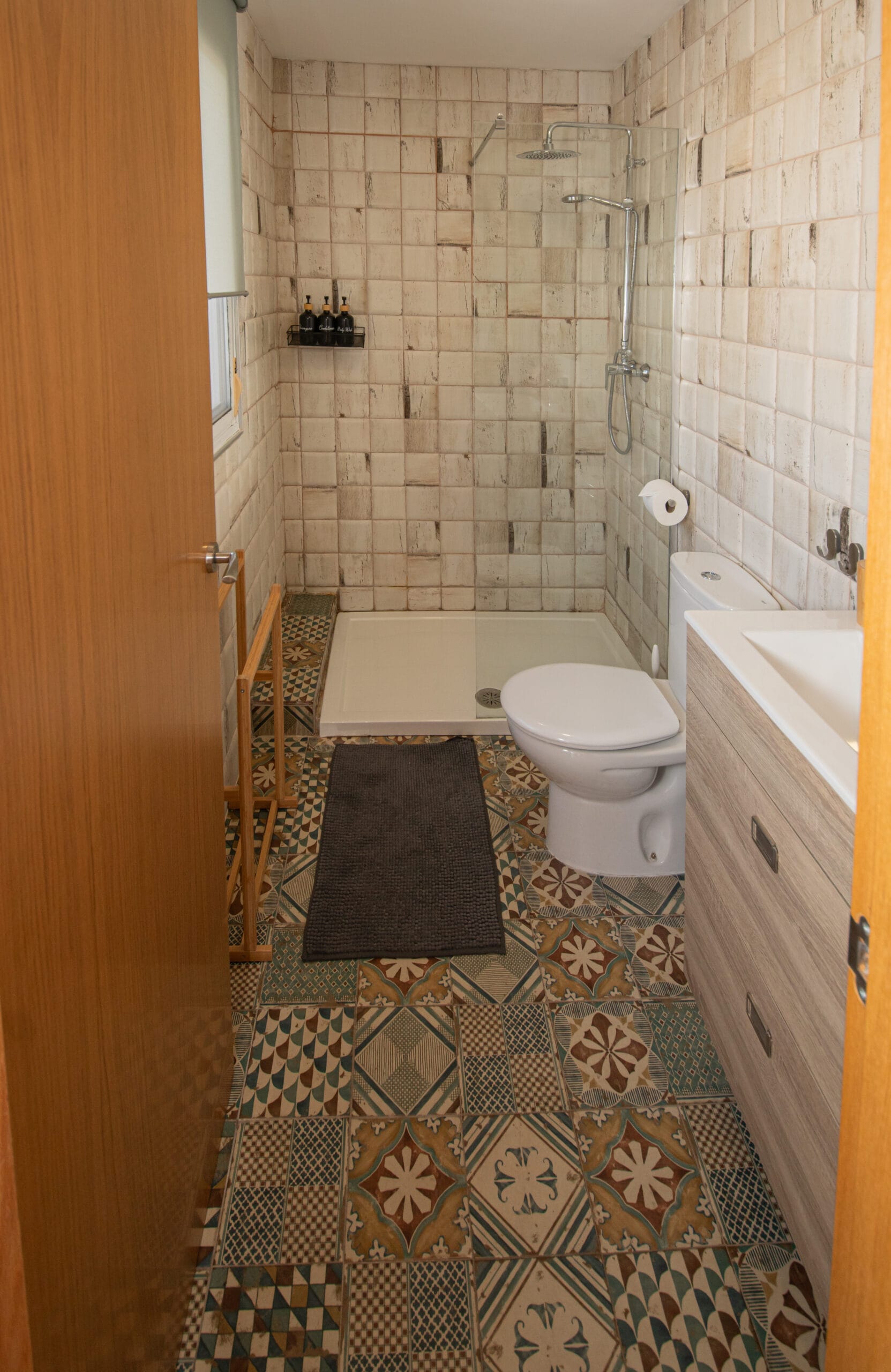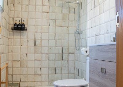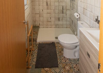 Badkamer in modern Andalusische stijl met douche, toilet, wastafel (handdoeken)