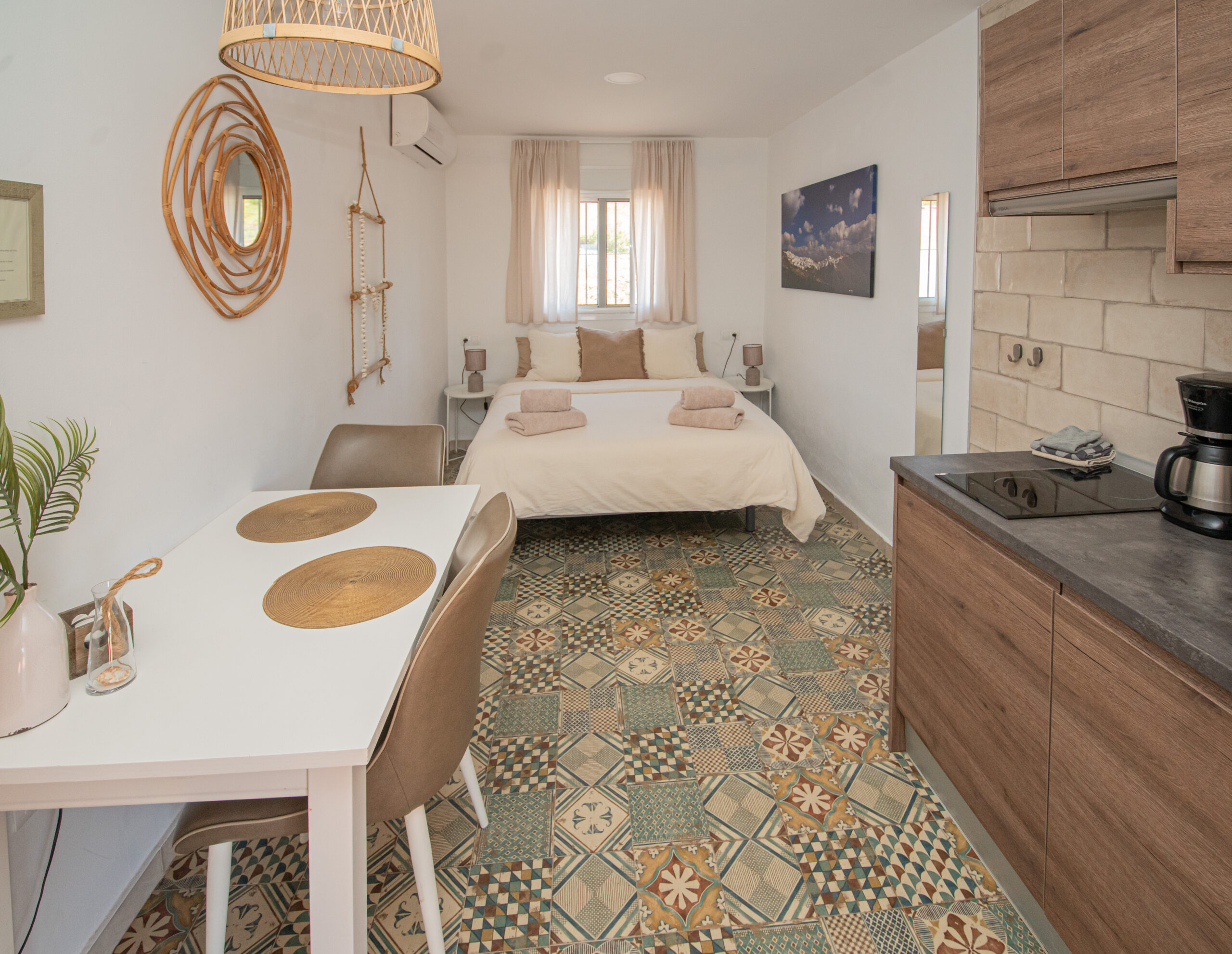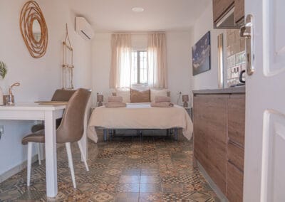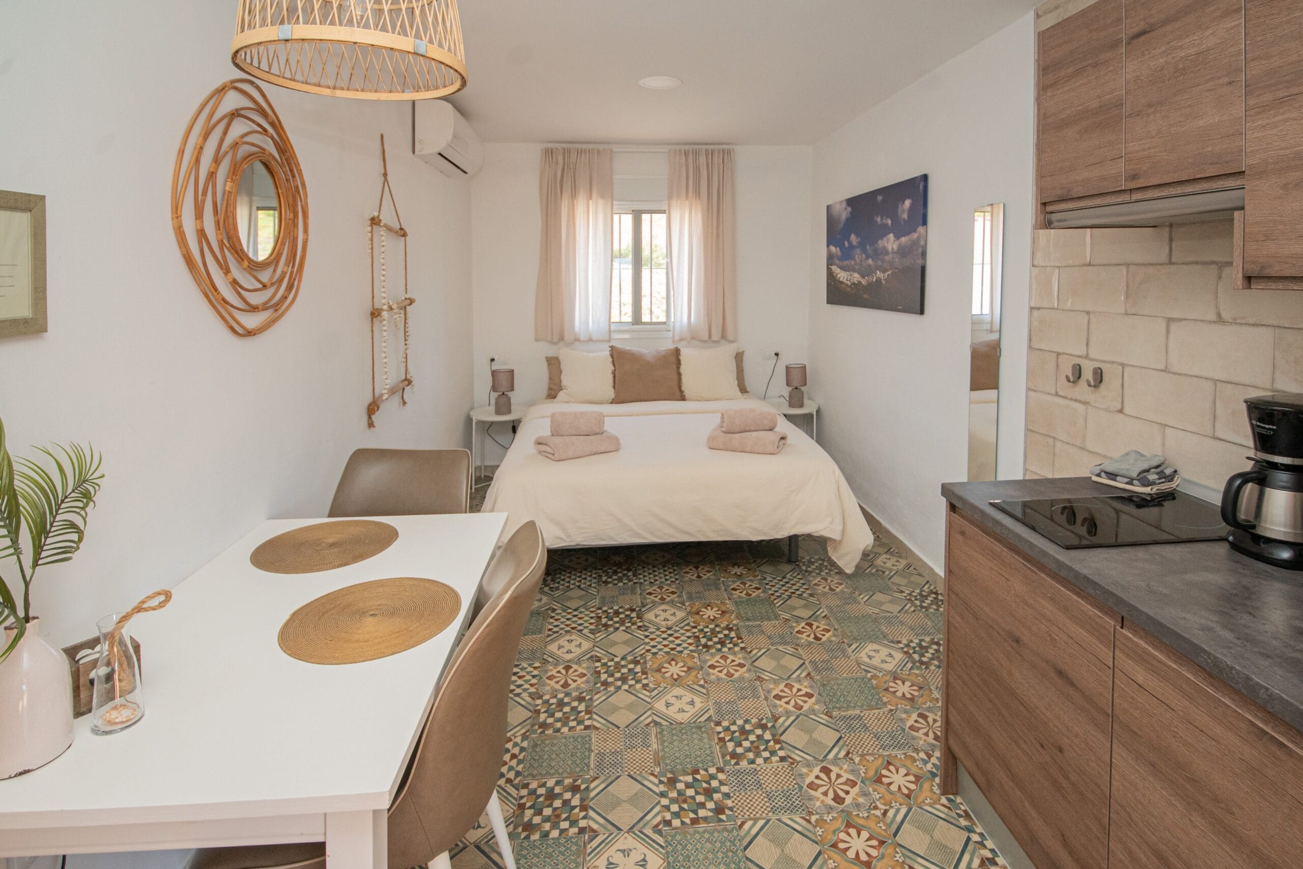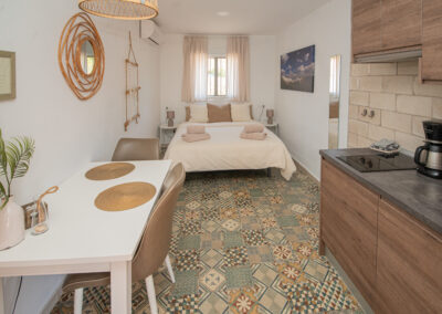 Het studio appartement is een verrassing en is meer dan je verwacht van een studio. Op de vloer ligt een typisch moorse tegel waardoor je direct in de fijne sfeer komt.